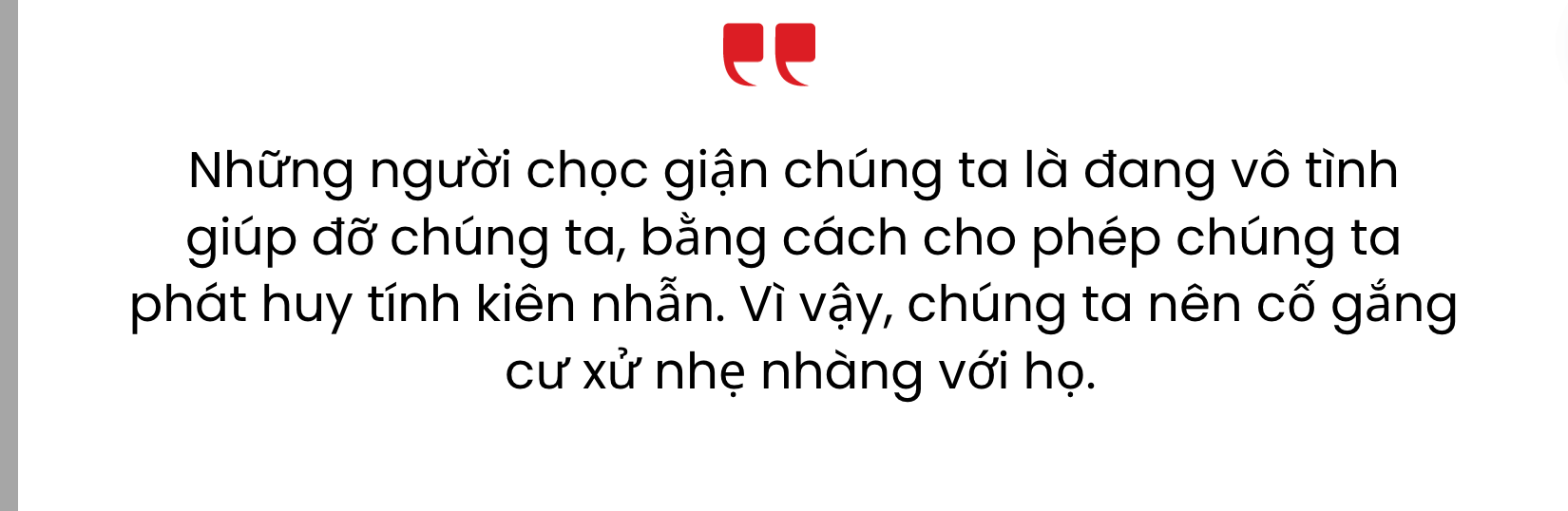 Thánh Thérèse Lisieux khuyên chúng ta: “Khi giận ai, cách tìm bình an là cầu nguyện cho người đó và xin Chúa thưởng ơn cho họ vì đã làm mình đau khổ”. Chúng ta thường không nghĩ thế này, nhưng những người chọc giận chúng ta là đang vô tình giúp đỡ chúng ta bằng cách cho phép chúng ta phát huy tính kiên nhẫn, vì vậy chúng ta nên cố gắng cư xử nhẹ nhàng với họ.