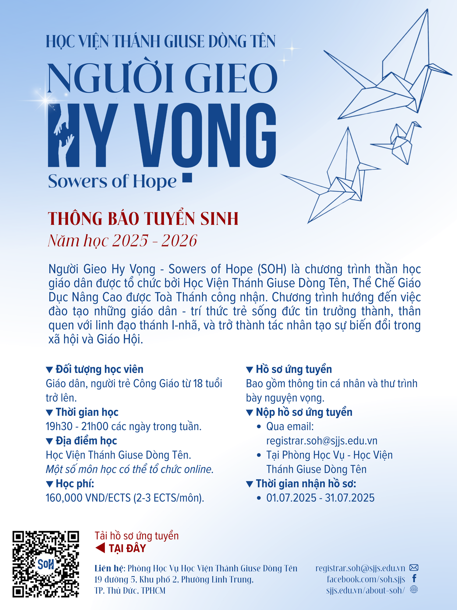 THÔNG BÁO TUYỂN SINH CHƯƠNG TRÌNH THẦN HỌC GIÁO DÂN NGƯỜI GIEO HY VỌNG – SOWERS OF HOPE (SOH)