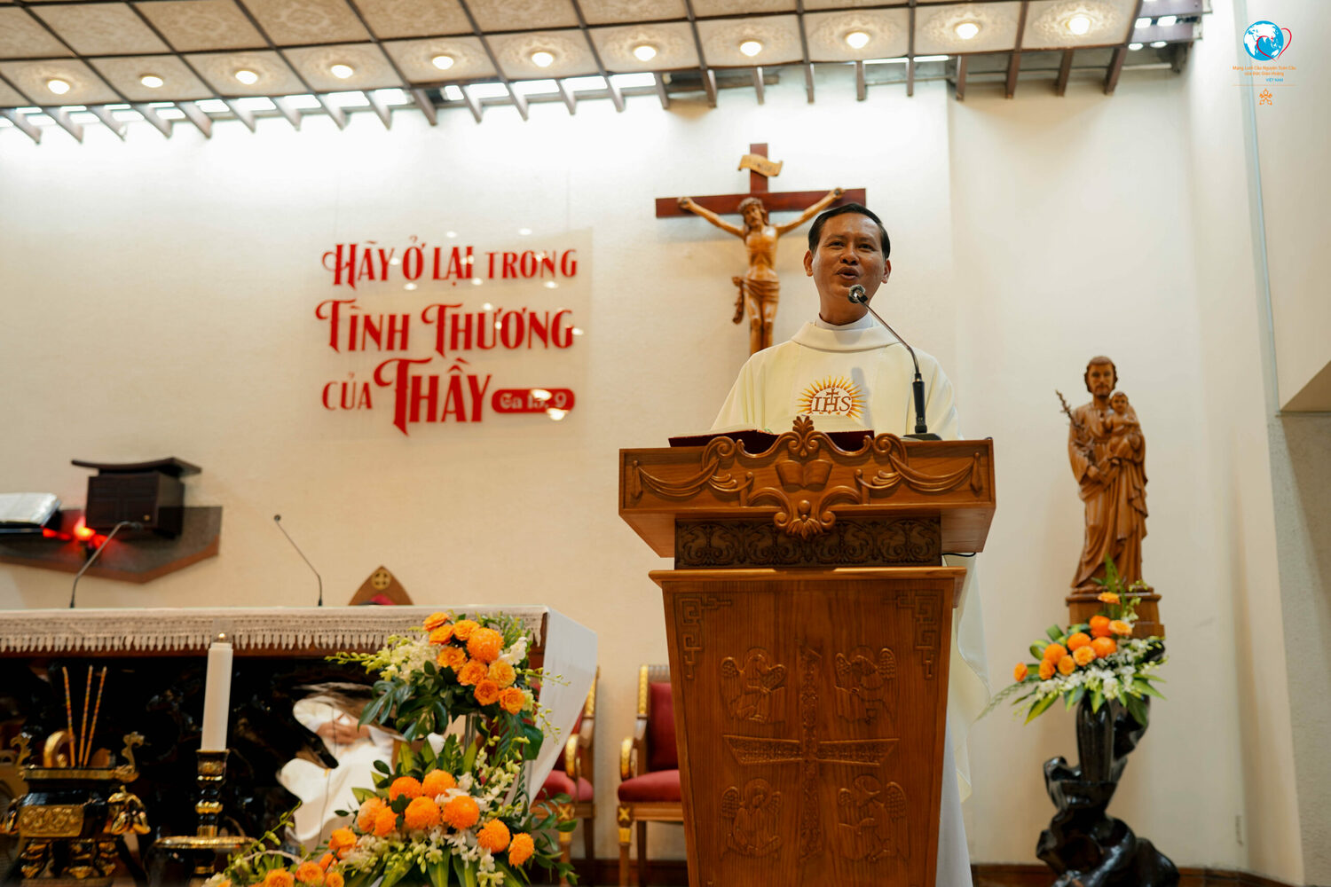Thánh lễ do Cha Chánh xứ Hiển Linh - Cha Phêrô Nguyễn Đức Trí, S.J. chủ tế, Cha Tôma Vũ Ngọc Tín, S.J. – Giám đốc Mạng lưới Cầu nguyện đồng tế. Trong bài giảng, Cha Tôma đã dẫn cộng đoàn chiêm ngắm Đức Giêsu Kitô là Vị Vua của Tình Yêu, Vua không ngai. Không như những vị vua trần thế dùng quyền lực để thống trị, Chúa Giêsu chọn cách trị vì bằng trái tim tự hiến, bằng ánh nhìn đầy xót thương và bằng những bước chân cúi xuống để nâng con người dậy. Ngài không lên ngôi trên ngai vàng, nhưng trên thập giá, nơi vẻ ngoài tưởng chừng là thất bại lại trở thành chiến thắng của Tình Yêu. Chính từ “ngai tòa” ấy, Chúa chạm đến từng người, chữa lành, tha thứ và mở ra con đường cứu độ cho nhân loại.